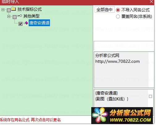* 关于股票公式时间限制,如果在引入大智慧公式,交易师公式或者飞狐公式的时候,发现公式名称栏是空白的,这时候调整电脑时间到1997年,又能出现公式名称,并且能正常显示,可能是公式使用期限已过。
