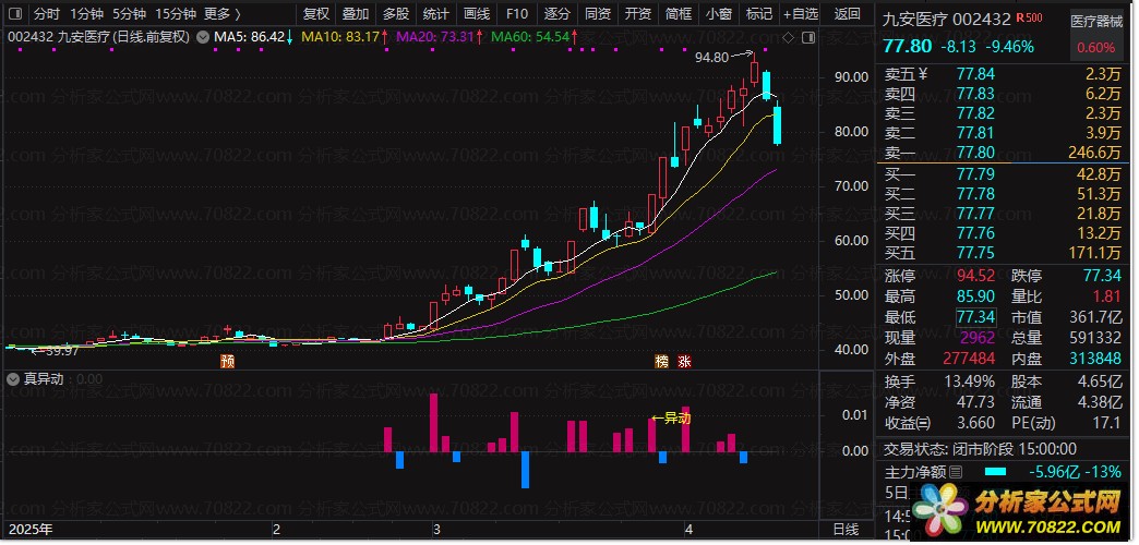 规避出货风险:当股价经历大幅拉升后,高位出现橙色柱,特别是伴随“←异动”信号消失或资金流向转为持续净流出时,应高度警惕主力出货,及时获利了结。