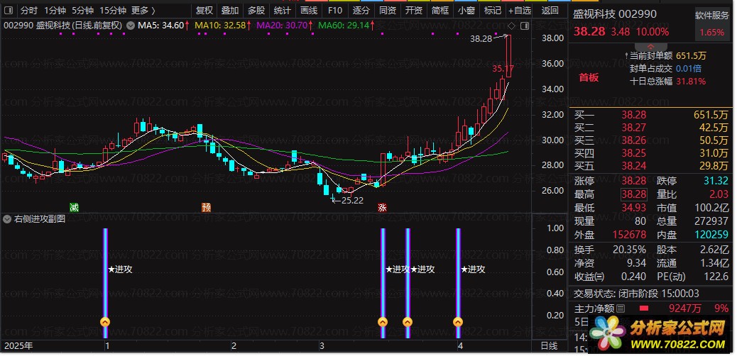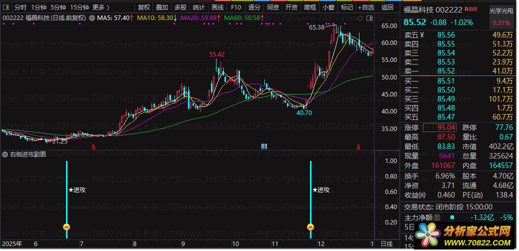右侧确认:当副图出现彩色柱体及“★进攻”字样时,即为右侧交易的精准买点。