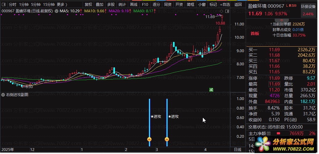 买入时机:当副图出现“★进攻”信号,且当天涨幅适中(如3%-7%),可在尾盘或次日开盘观察承接力介入。