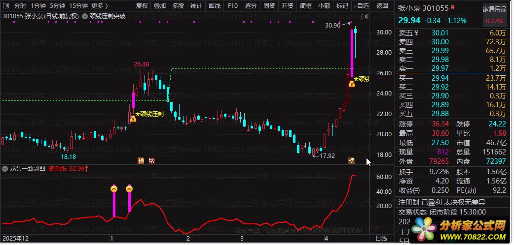 选股公式用法:直接运行选股公式,可以快速从全市场中筛选出同时满足“趋势多头、站稳成本、动能启动”三大条件的个股,极大地提升了复盘和盘中选股的效率。