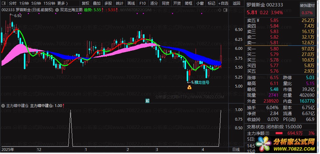 本公式为一款基于通达信平台的主力暗中建仓选股公式,旨在通过量化模型识别主力资金在底部的隐蔽吸筹行为。其核心逻辑在于,当股价经历长期下跌或盘整后,若出现价格动能转强、短期均线拐头向上、成交量温和放大且当日收阳等条件共振时,往往预示着有主力资金正在悄然进场布局。