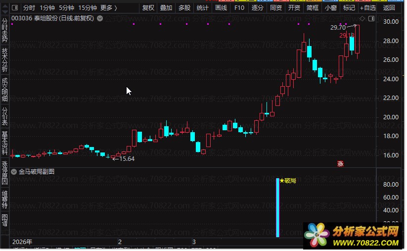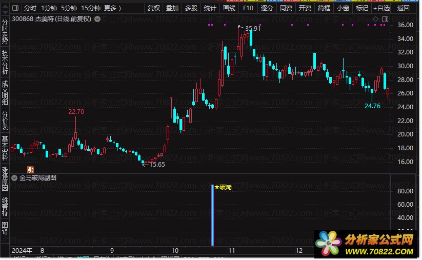 副图指标应用:将金马破局副图指标安装并加载至个股K线图下方。当图表中出现粉色柱状线并伴随“★破局”文字信号时,即为主力完成洗盘、即将起爆的明确信号,是最佳介入参考点。