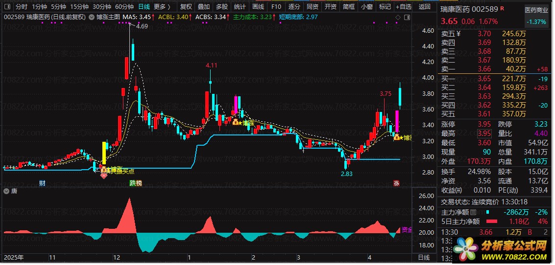 ★博涨信号:当K线下方出现洋红色的K线实体并伴有“★博涨”文字标注时,表明个股已满足特定的量价异动条件,预示着一轮快速上涨行情可能即将展开。