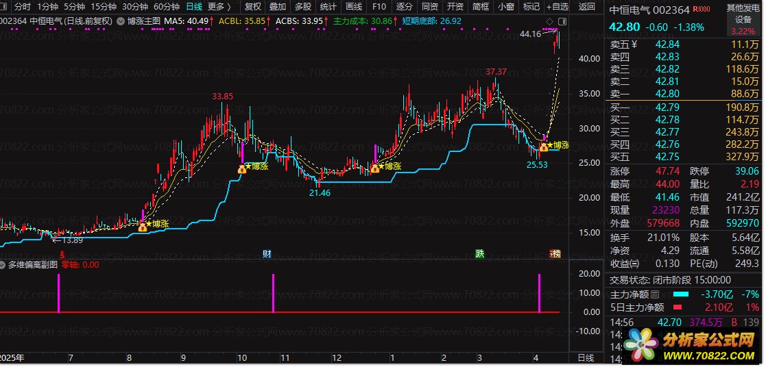 〖多维偏离〗指标套装,精准捕捉主力洗盘结束与趋势反转的共振买点 本公式是一款基于筹码分布与均线乖离率构建的复合型副图指标,属于高阶的通达信股票指标公式。其核心逻辑在于通过“多维”视角,量化股价偏离均线的程度以及市场筹码的集中度,从而在复杂的行情中识别出高胜率的抄底信号与趋势转折点。