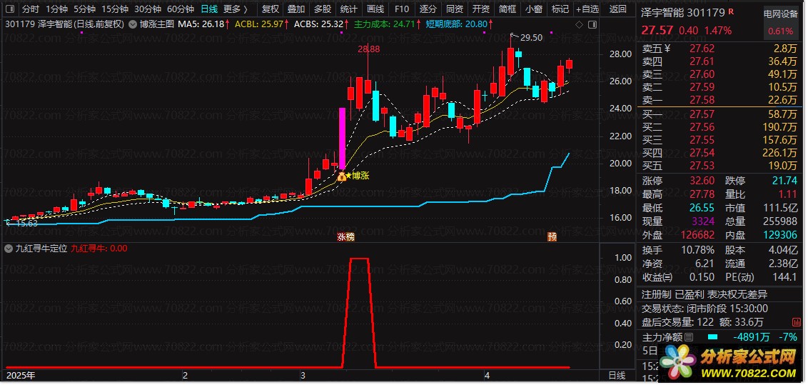 使用方法:在通达信中导入公式,当出现紫色粗线(COLOR0000FF)信号时,可结合量能、均线系统二次确认。适用于日线级别中短线交易,需注意回避ST股及高位放量滞涨风险。本指标融合波动率控制与趋势跟踪,是捕捉主升浪的实战利器,助力投资者精准把握买卖时机。