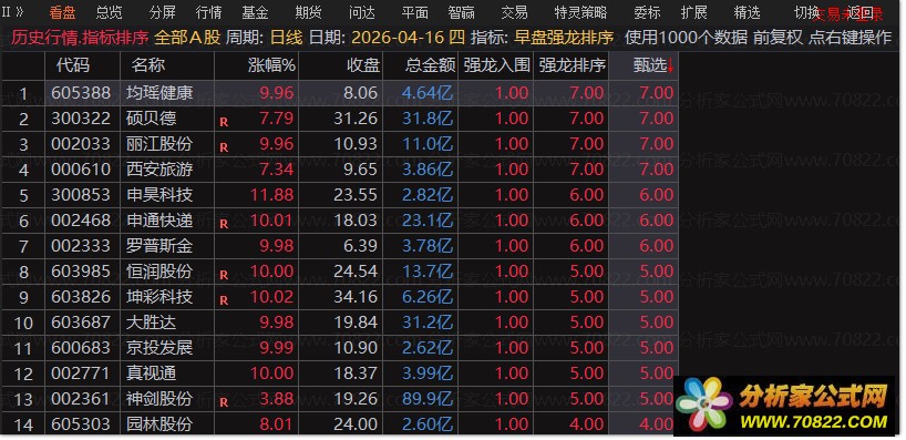竞价结束:交易日9:25-9:30,在通达信界面输入.401调出历史行情指标排序,选择“早盘强龙排序”。