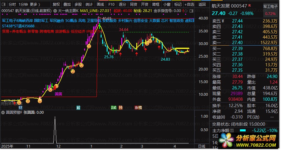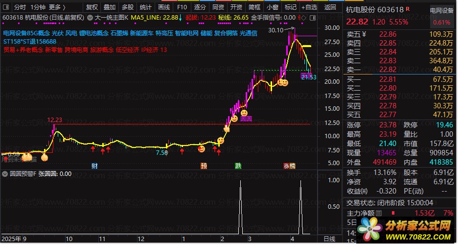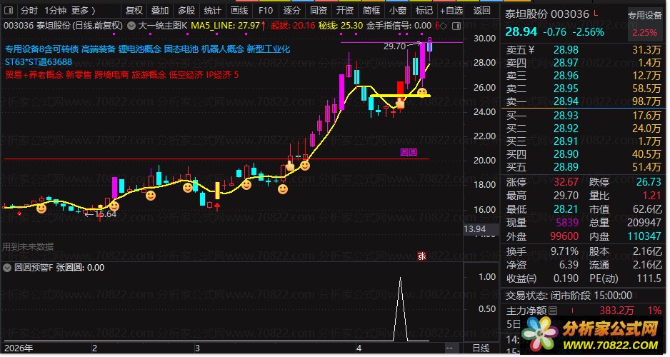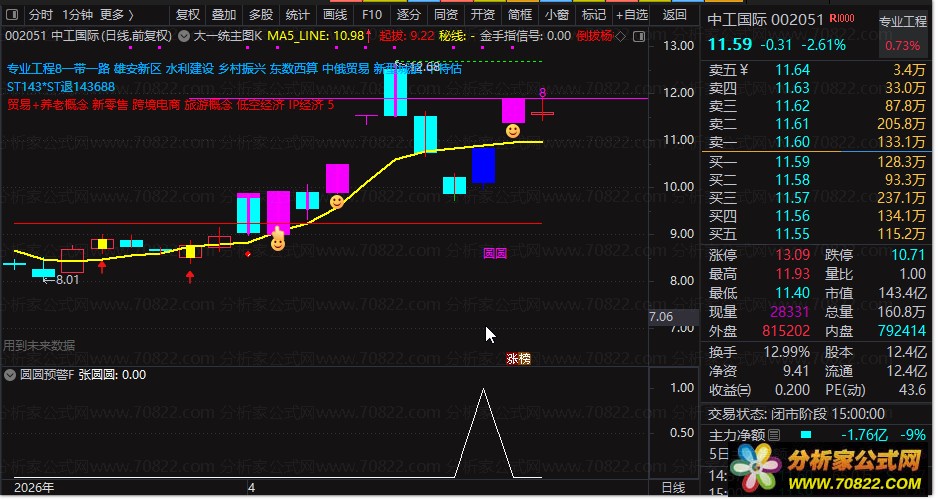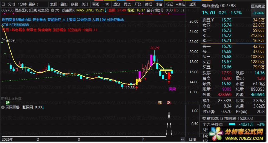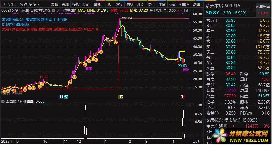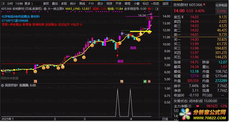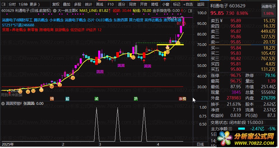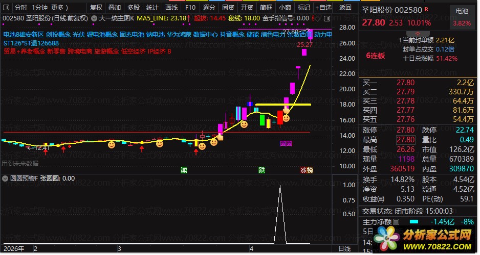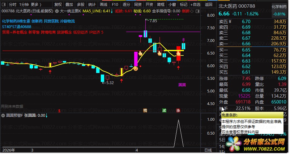 〖圆圆预警 大一统主图〗一年十倍绝不成问题! 本指标包含1个主图1个副图和1个选股,可盘中预警,最低位置可在1%以内预警,一般2%-5%预警,只要不高位追 一年十倍绝对没问题,偶尔失败的次日务必及早出局。本指标完全加密。直接用,有惊喜。