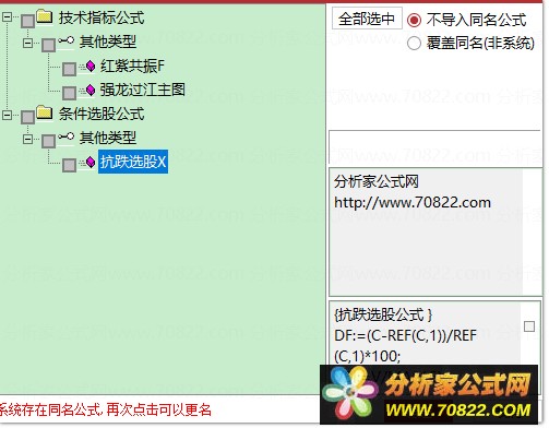 针对这种特殊行情,专门优化了特供选股公式,筛选跌幅小、有主力吸筹迹象的股票。筛选条件比较严格,适合行情下跌时使用,所以我也把它叫做抗跌选股。下跌市才是检验好股票的最佳时机!下跌行情 → 寻找“跌不动的”(抗跌模式)。