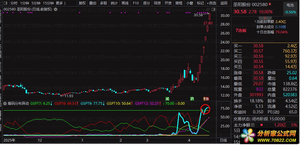 指标中,红色线(gspt8)反映了当前收盘价下市场的获利盘比例,是判断市场人气与抛压的重要参考。青色粗线(gspt9)及其黄色均线(gspt10)则用于衡量低位资金的承接力度,当它们持续上行,往往暗示主力在积极吸筹。绿色线(gspt7)与洋红色线(gspt12)则分别从不同角度揭示了股价的短期强弱与超买超卖状态。