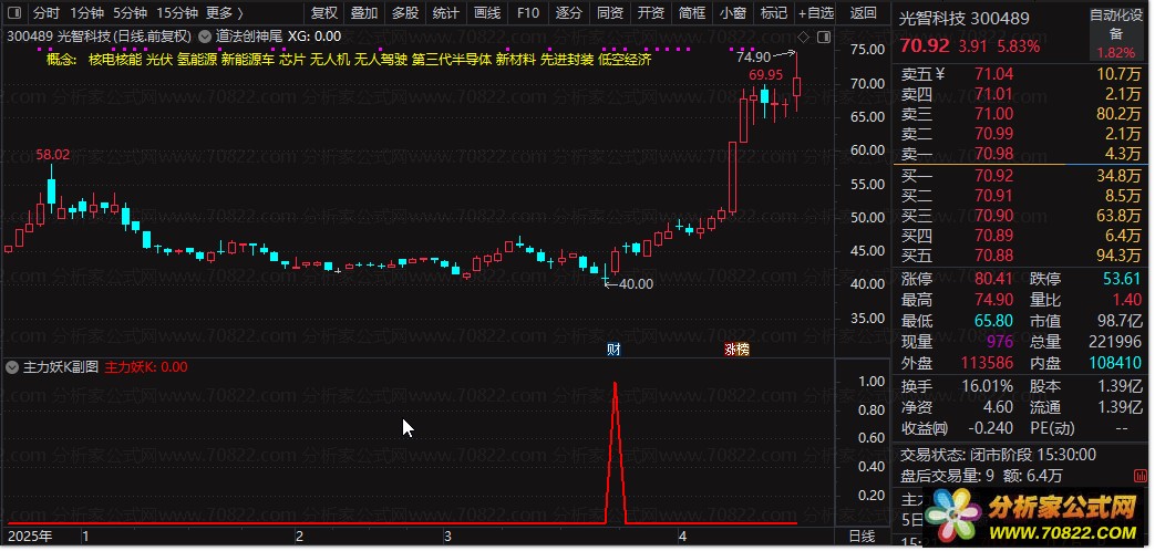 通达信〖妖K擒龙诀〗副图/选股指标,多维共振锁定主力妖股起爆点! 本指标为副图公式,核心逻辑是通过7项技术评分(均线多头、KDJ金叉、MACD金叉、量能放大、筹码集中等)与量能异动,筛选具备涨停基因的强势股。当“主力妖K”信号(红色粗线)出现时,代表个股满足多重共振条件,且近期有涨停或极端异动特征,是主力资金介入的明确信号。