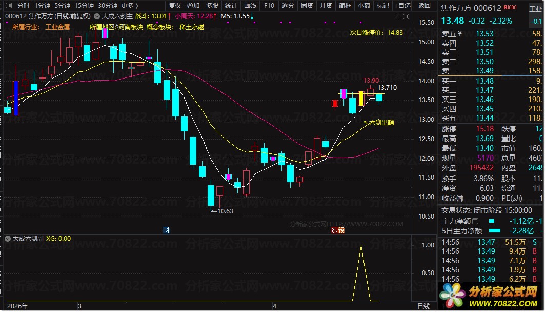 量价突破预警机制:【大成六剑】指标核心逻辑在于捕捉突破前高量的关键时机。主图界面经过特殊优化,设有明显的画线标记,当股价有效突破该横线时即触发信号(系统智能保留最近一个关键点位)。