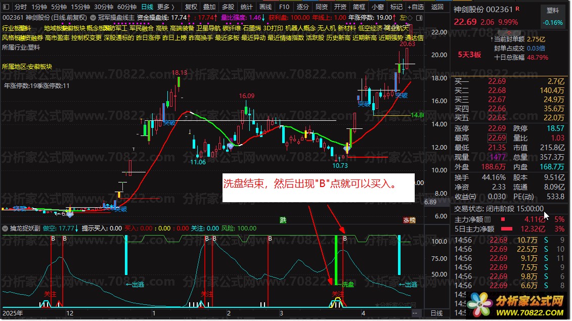 网友要求,增加了一个选股:先出现“洗盘”这个信号,然后N天内出现“B”字母信号就选股,放入附件了。 |
