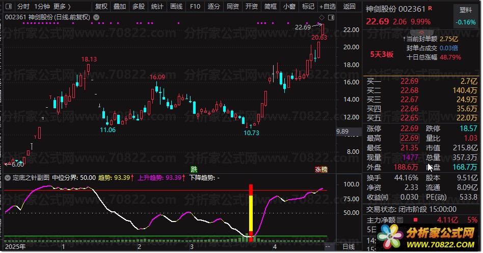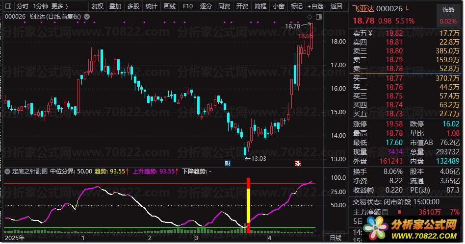 这款名为“定底之针”的通达信指标是一款功能强大的副图及选股工具。它通过独特的算法,结合25日周期内的高低价差来精确计算市场的趋势强度。当短期动能突破长期均线并满足特定条件时,指标会及时发出红黄柱状的明确信号,帮助投资者把握关键时机。