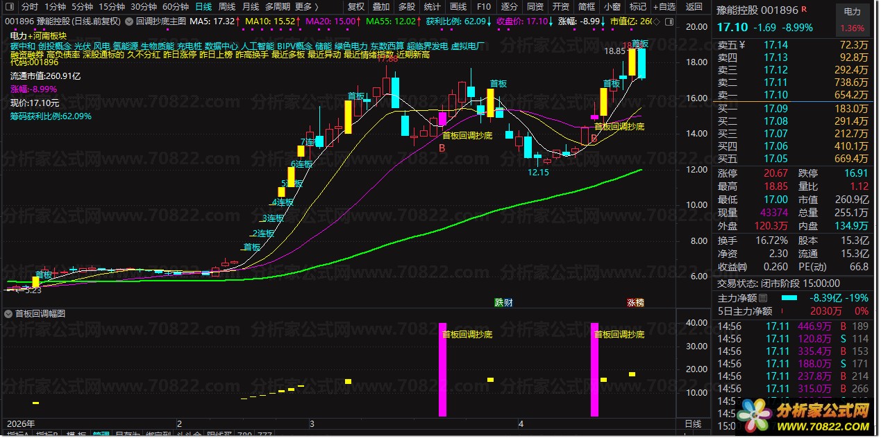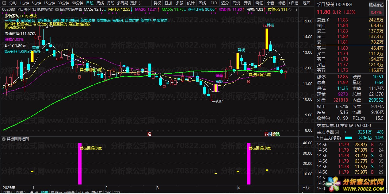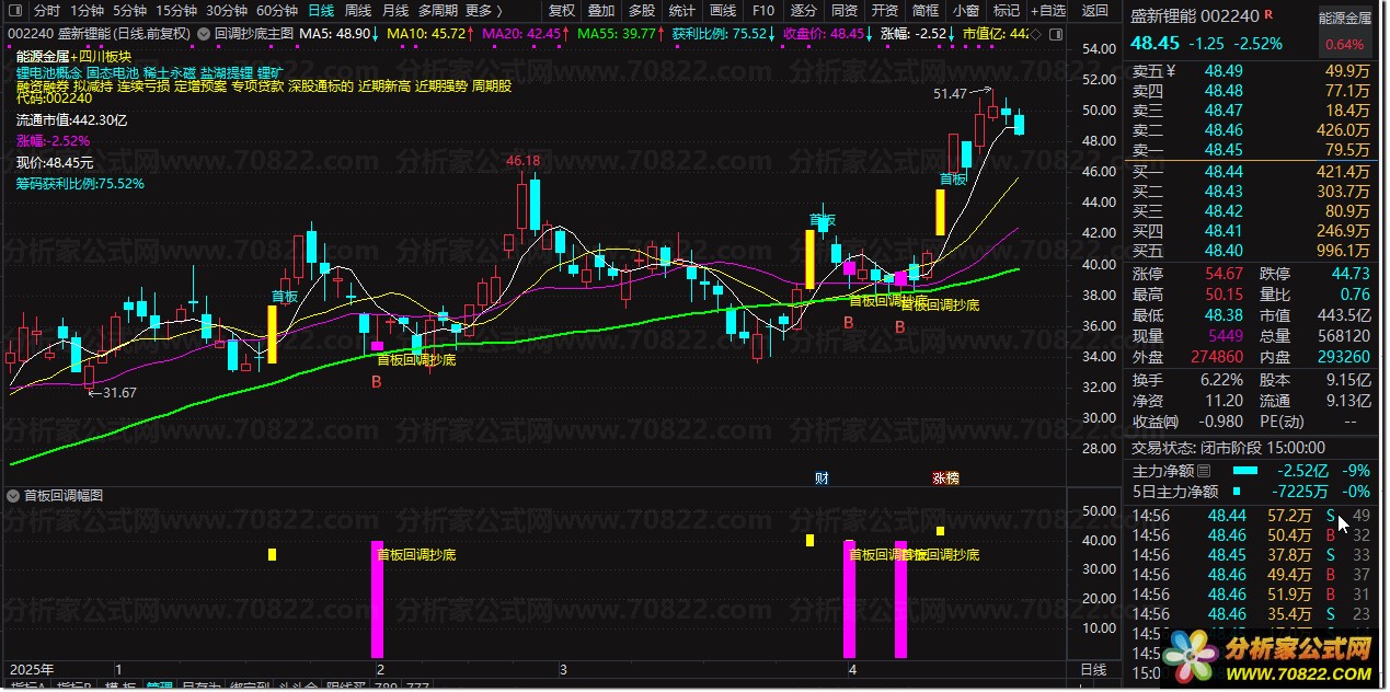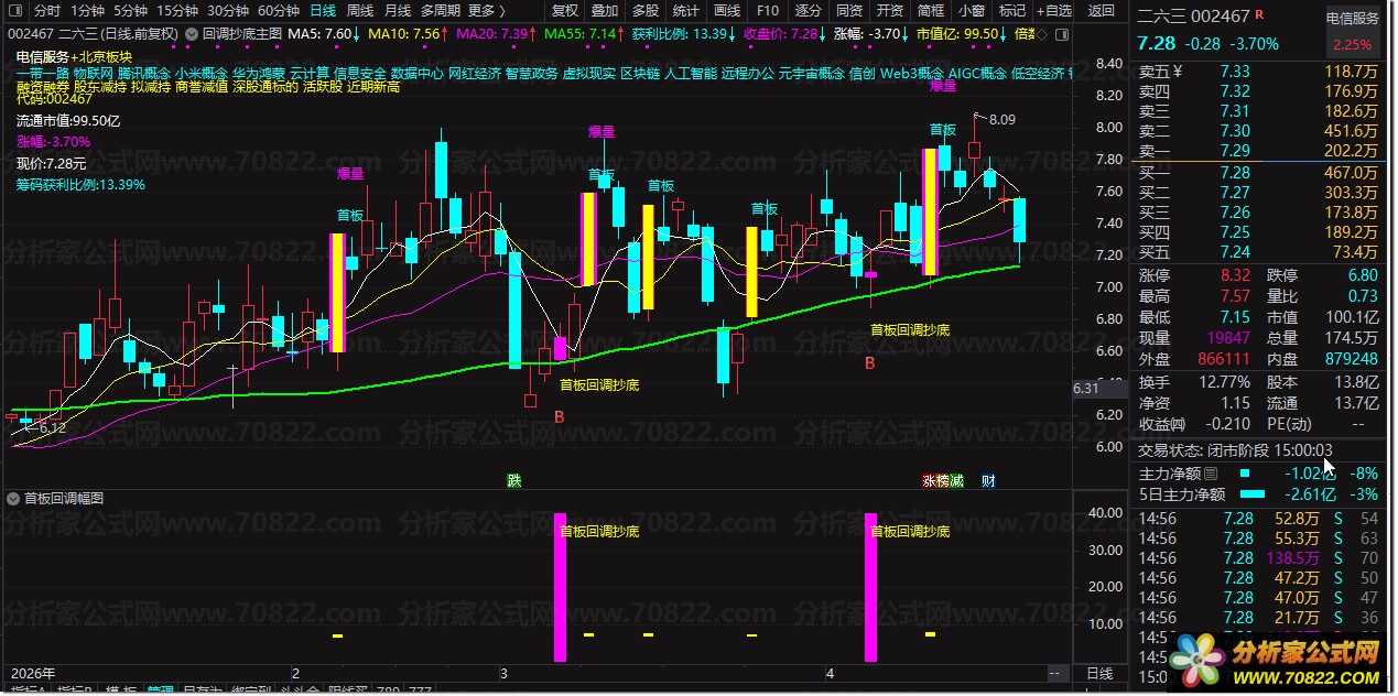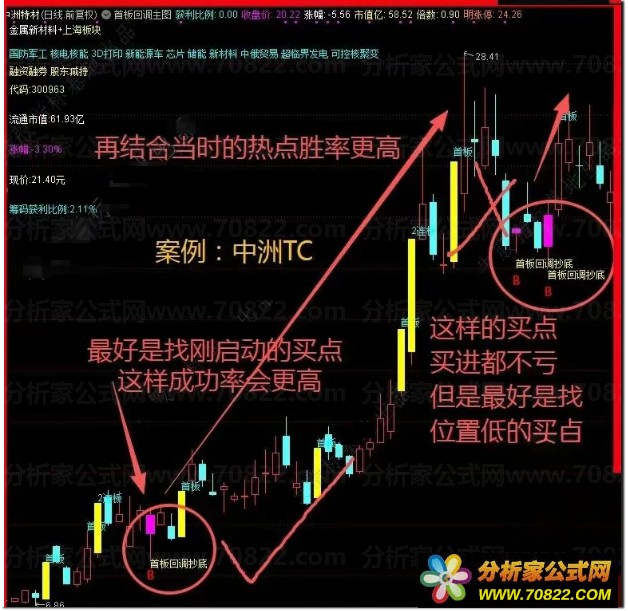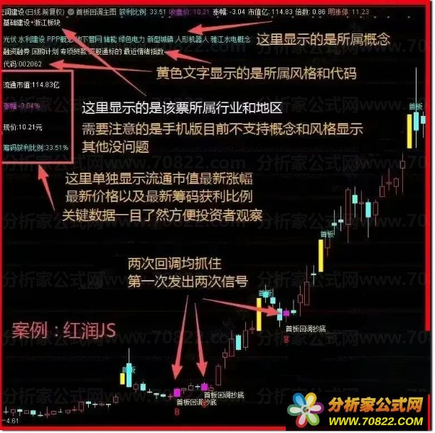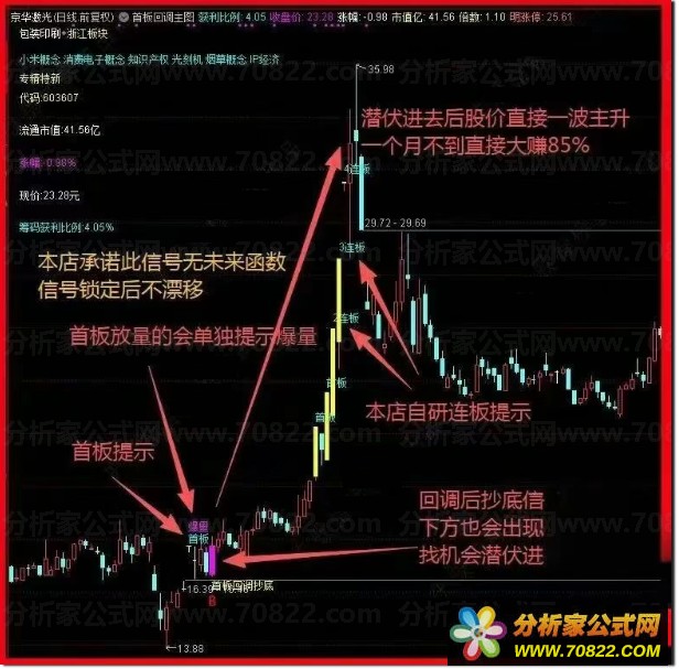 此外,该公式还集成了多维度信息面板,实时显示行业概念、流通市值、获利筹码比例等核心数据,并自动标记连板高度与爆量信号,助您全面把握个股动态。此策略完美契合“强者恒强”的市场规律,是短线交易者寻找二次起爆点的得力助手。