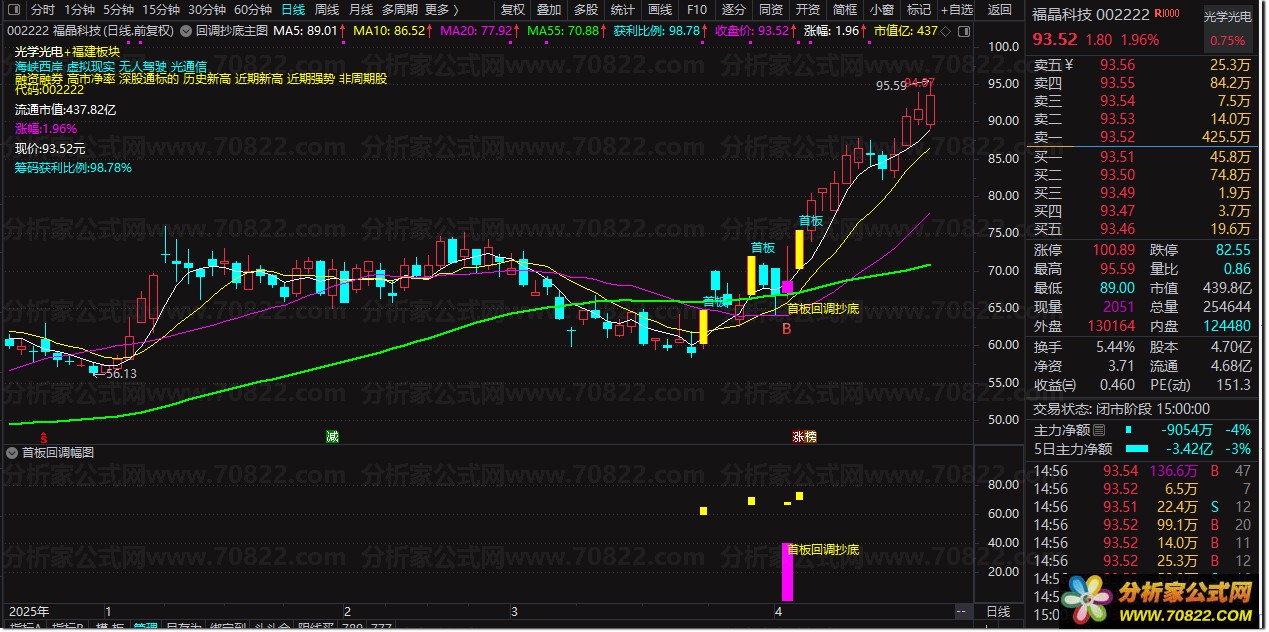 本指标专为捕捉“强势股首次涨停后的回调低吸机会”而设计,通过量化模型精准识别主力洗盘结束的信号。它首先锁定近期出现过“首板”(第一个涨停)的强势个股,然后严密监控其股价是否缩量回踩至涨停阳线的关键支撑区域。一旦满足止跌企稳条件,便会以醒目的“首板回调抄底”文字和图标在K线图上发出明确买入提示。
