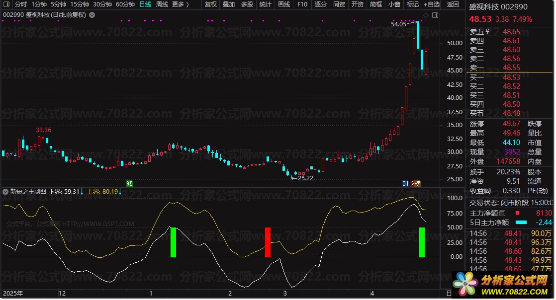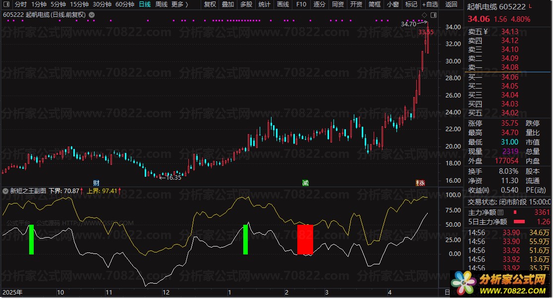 本指标为【新短之王】,是一款专门用于捕捉个股超跌反弹机会的实战型股票指标公式。它通过多维度算法模型进行综合研判,当监测到短期价格跌幅过大、动量指标处于低位并形成金叉时,会进一步结合成交量萎缩及均线支撑情况来确认信号。一旦各项条件满足,系统将发出明确的买入提示(显示为红色柱状),帮助投资者在低位寻找入场时机;而绿色柱状则代表卖点信号,提示风险或离场点,辅助大家进行波段操作。