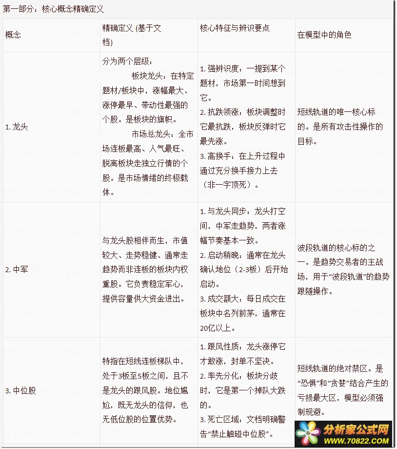 大家其实对龙头,中军,核心,抱团票都有一个误区,比如通达信里的板块龙头或行业龙头,他不一定是板块启动时的龙头或中军,所以很多产生误区的就会在板块里找一些行业的龙头来进行操作。但事实上每次热点板块的启动时,他的龙头都不相同,也不一定是行业里的龙头。其实他们都是资金关注而走出来的,才算是龙头,核心。这个公式就是根据这个逻辑而明确了在不同阶段,不同板块的运行走势的情况下,明确个股的地位定义。帮助大家简化这个过程,直接确认龙头核心,然后根据不同位置,不同的交易习性,自行去选择个股,但起码会减少大家选到杂毛的概率。