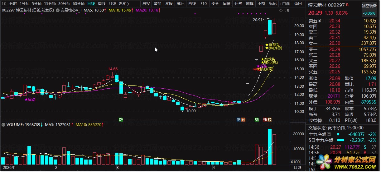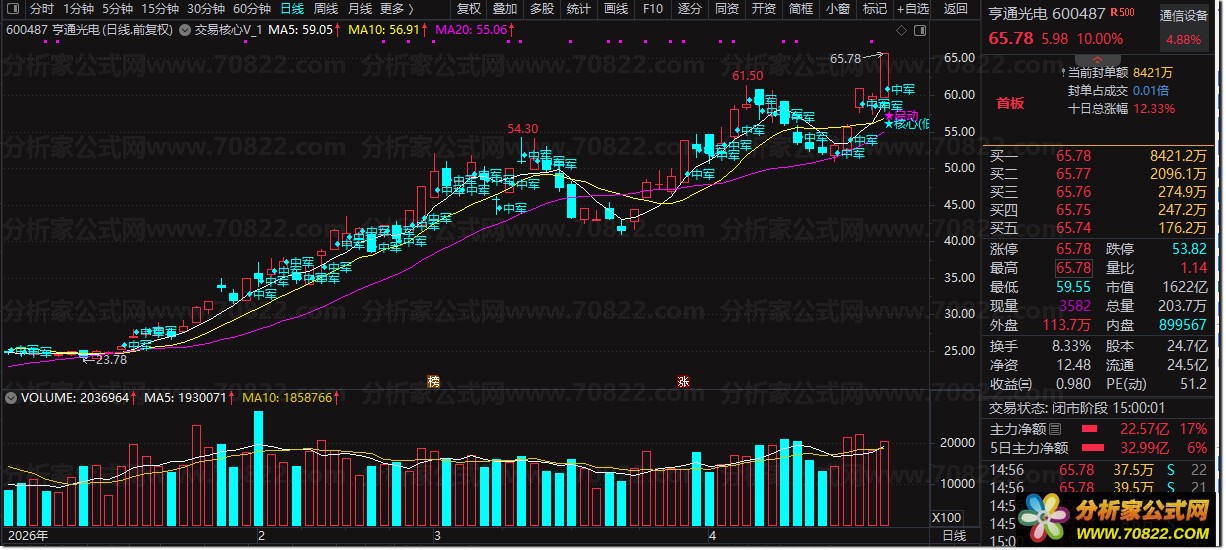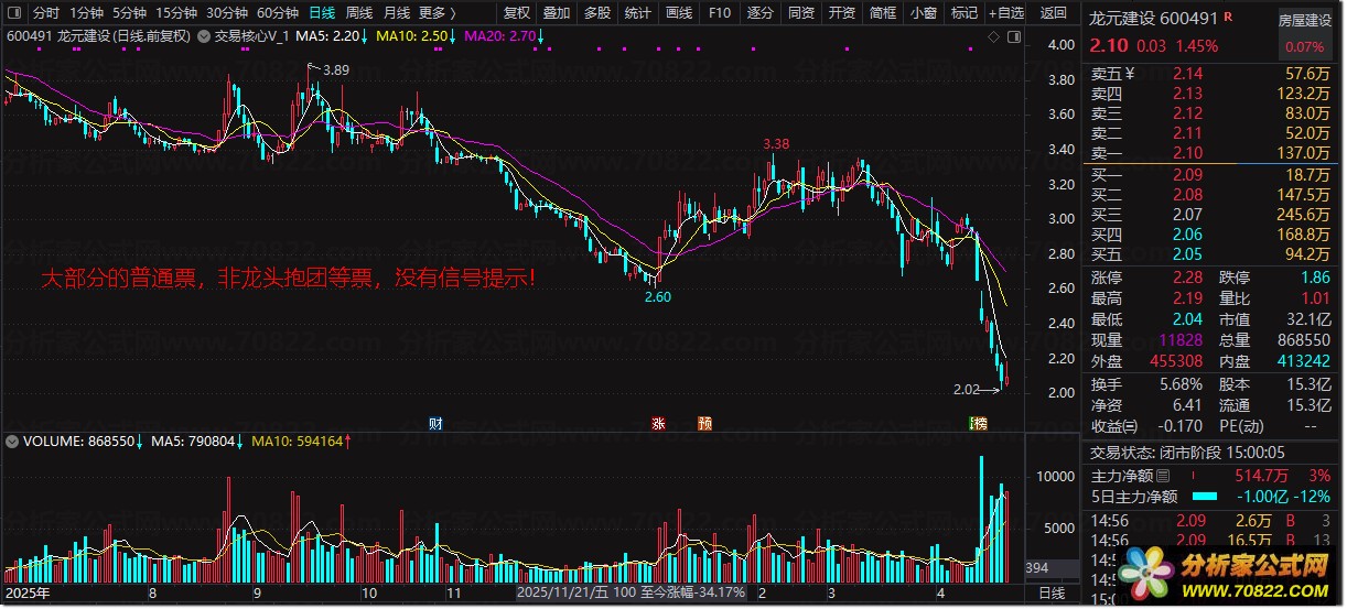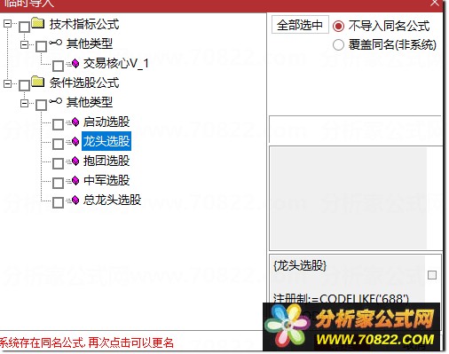 〖交易核心V8.1_0〗龙头中军核心的定义公式 不停打磨且经实战 配备龙头抱团选股 本公式根据网络大神的经典视频和语录进行的总结,分辨出各种市场中各种股票的明确定义。明确一个关键的问题,为什么有些板块上涨而板块内很多股却不涨,而有些股却能持续的上升呢?那是因为市场的5000只票里,资金关注的个股永远就是龙头,核心,中军,抱团,除了这些股以外不就都是跟风和杂毛票。该公式基本解决了个股在板块内的定位,确定了每一波板块或市场上涨中的个股的地位。