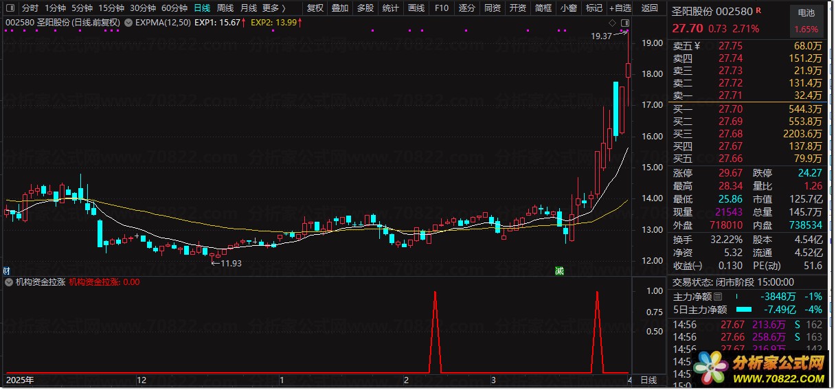 机构资金拉涨:BARSSINCEN(gspt31,9)=0 AND gspt32,LINETHICK2,COLOR0000FF;
