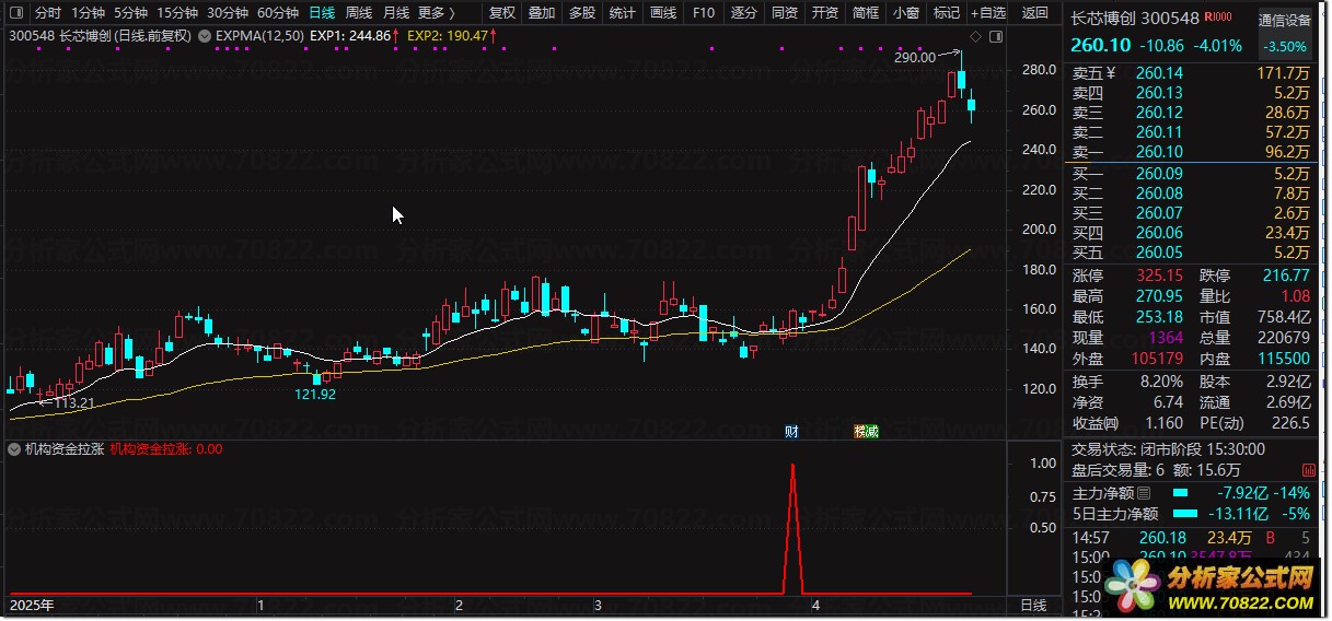 1. 副图应用:导入公式后,个股K线界面调出指标,出现**红色粗线信号**即为机构资金拉涨启动点;