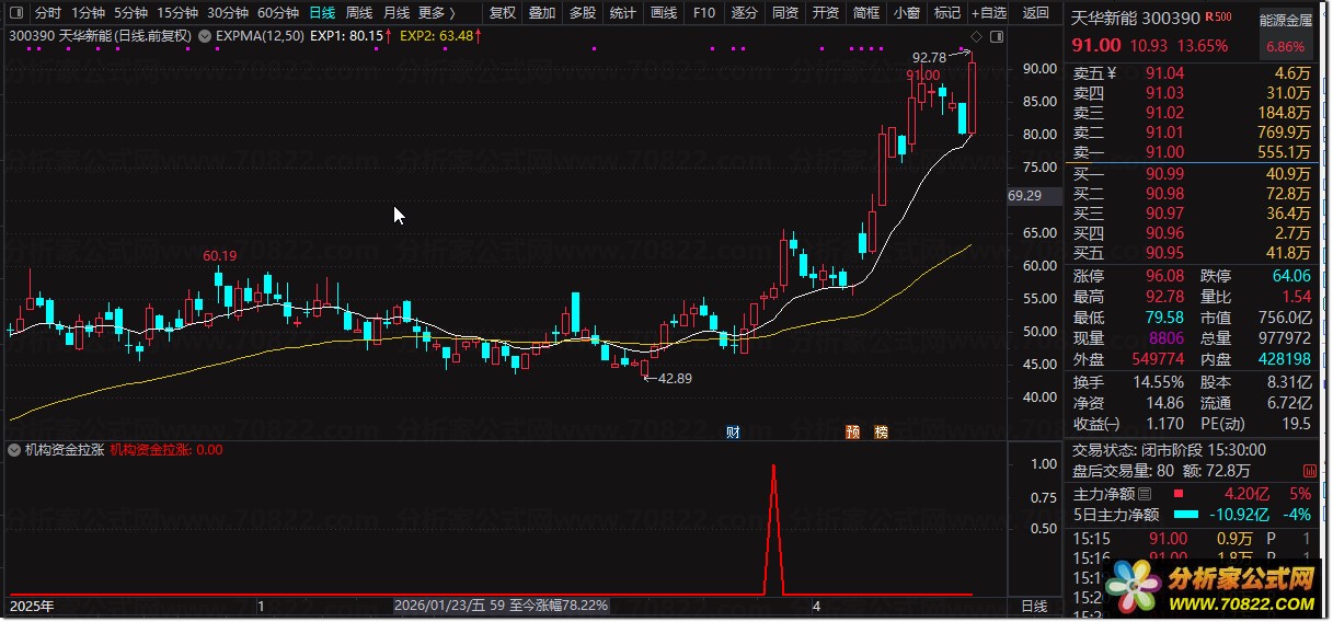 【机构资金拉涨】是通达信通用的副图+选股二合一指标,从**机构筹码分布、主力资金强度、股价趋势角度**多维建模,融合55日长期筹码、13日短期均线、获利盘比例、成交量换手率等核心数据,通过多重函数运算过滤弱势信号,精准锁定机构资金进场后的拉涨启动点,无未来函数,信号不漂移,兼顾短线起爆与中线主升行情。