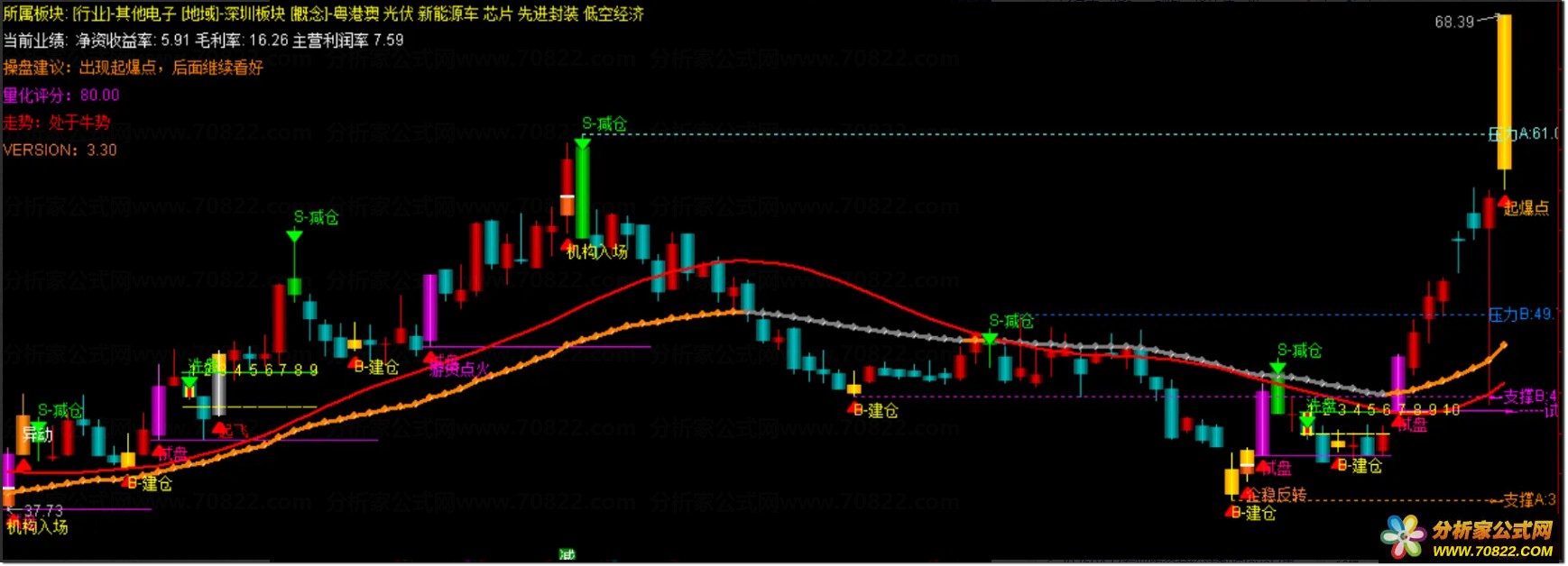 建仓只是起点,真正的主升行情始于资金接力与趋势加速。当股价成功站稳主图红色趋势线之上,并出现橙色“异动”或紫色“游资点火”柱状信号,说明主力已完成控盘,市场活跃度显著提升,进入快速拉升阶段。此阶段是加仓的黄金窗口期,只要股价未有效跌破红色趋势支撑线,即可坚定持有,充分分享主升浪带来的可观收益。