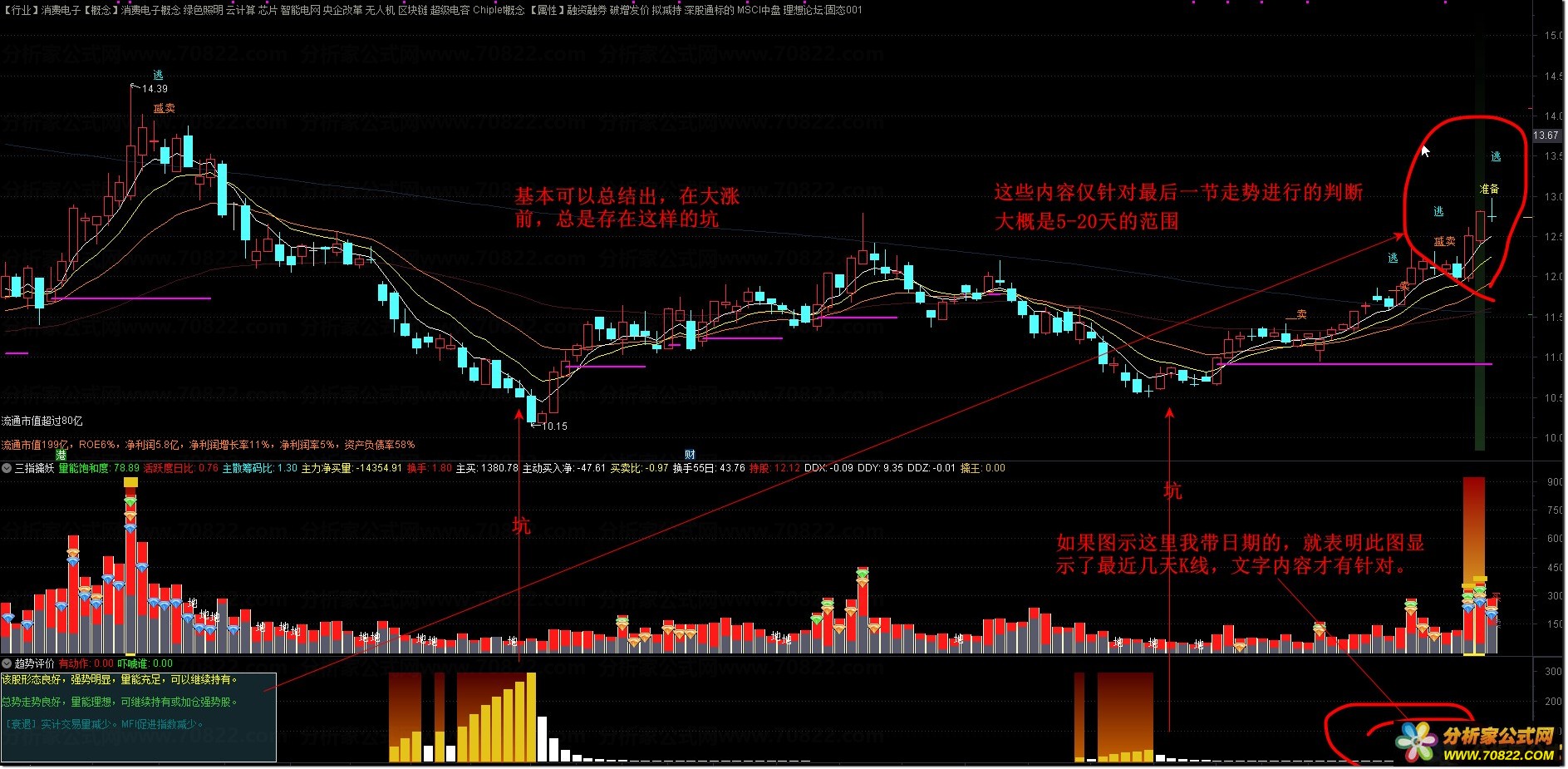 顶部固定文字:例如“量能理想,明显走强,中线参与,仓位70%”等,直接参考仓位建议。