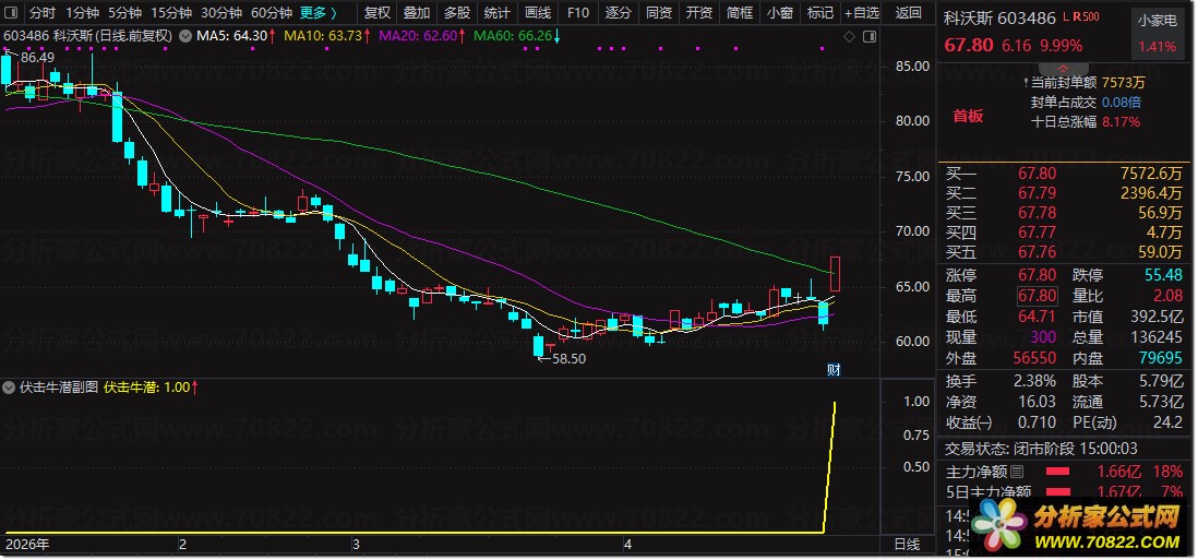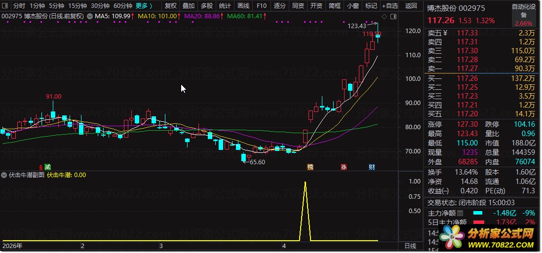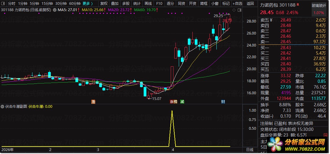 多维度信号共振:“伏击牛潜”指标的核心逻辑在于综合研判。它通过监测成交量的异常放大、K线形态上标志性的大阳线以及股价对关键价位的强势突破等多重信号。同时,指标会结合均线系统的多头排列与MACD指标的转强信号进行二次确认,力求在多头趋势确立初期发出提示。