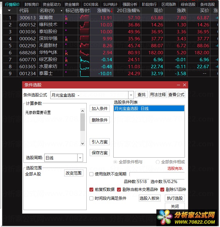 适用场景:每日早盘 9:26-9:30 竞价结束后,用于“条件预警”或“综合排序”。