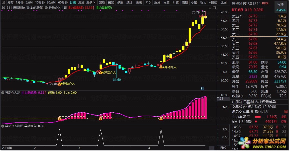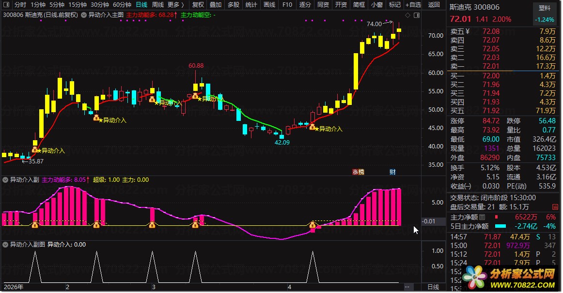 信号定买点:当主图出现“★异动介入”文字提示,或副图出现黄色“超级”柱状线及图标时,代表个股出现明显的放量异动,是短线极佳的介入时机。