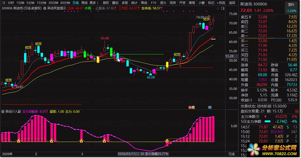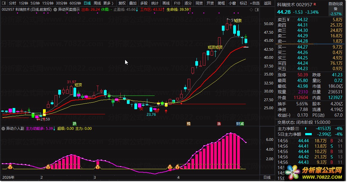 本款通达信异动买卖提示主图指标,核心逻辑清晰明了,通过三条趋势线直观指导交易节奏,严格遵循线上持股操作、线下空仓休息的原则。当股价有效突破红色看多平台时,指标会精准画出相应的突破出击信号标记,提示投资者把握短线爆发机会。同时,当股价上涨至压力位出现短线见顶迹象时,指标会及时给出短顶风险提示。此外,一旦股价跌破关键的绿色趋势支撑线,指标将发出明确的卖出指令,帮助投资者规避下跌风险,是辅助短线趋势交易与风险管理的实用股票指标公式。