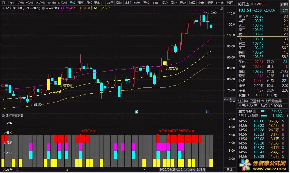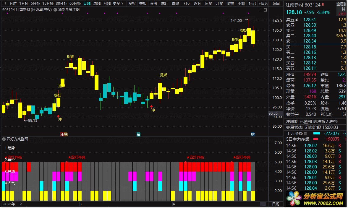 当副图上四个色带全部变红(见图示意),意味着该股进入了“强趋势+有资金+有环境”的共振区。