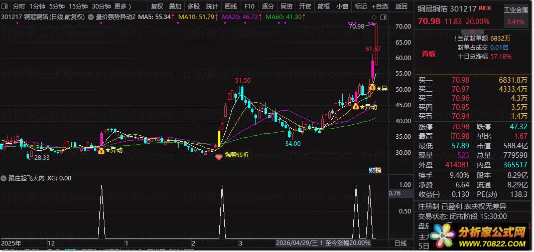 信号触发:当公式选出个股(XG=1)时,代表该股当日同时满足“大单资金净流入强劲(大单信号≥200)”、“股价强势拉升(涨幅≥3%)”以及“收盘价有效突破游资压力线”三大严苛条件。